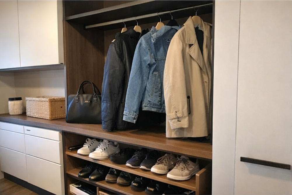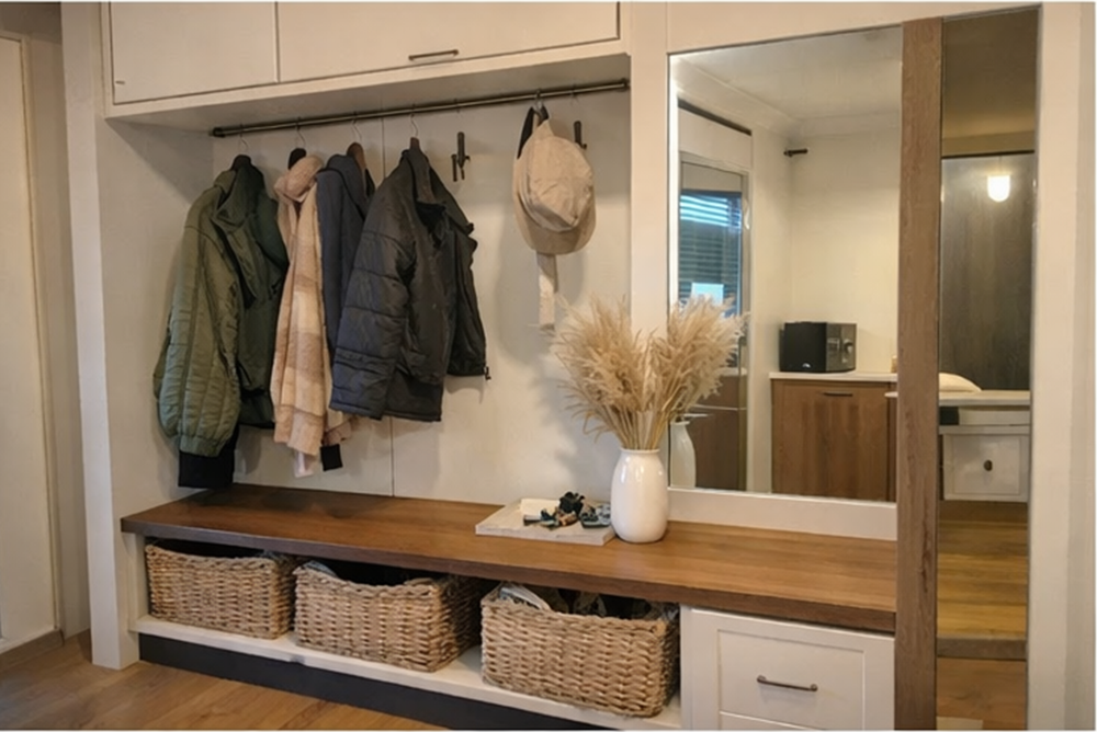 Evinizin girişinde hem şıklığı hem de fonksiyonelliği bir araya getiren özel tasarım vestiyer projesidir. Aynalı kapaklar sayesinde mekanın daha ferah görünmesi sağlanmış, gizli depolama alanları ile dağınıklık ortadan kaldırılmıştır. Dayanıklı MDF lam malzeme ve birinci sınıf aksesuarlar kullanılarak uzun ömürlü bir kullanım hedeflenmiştir.